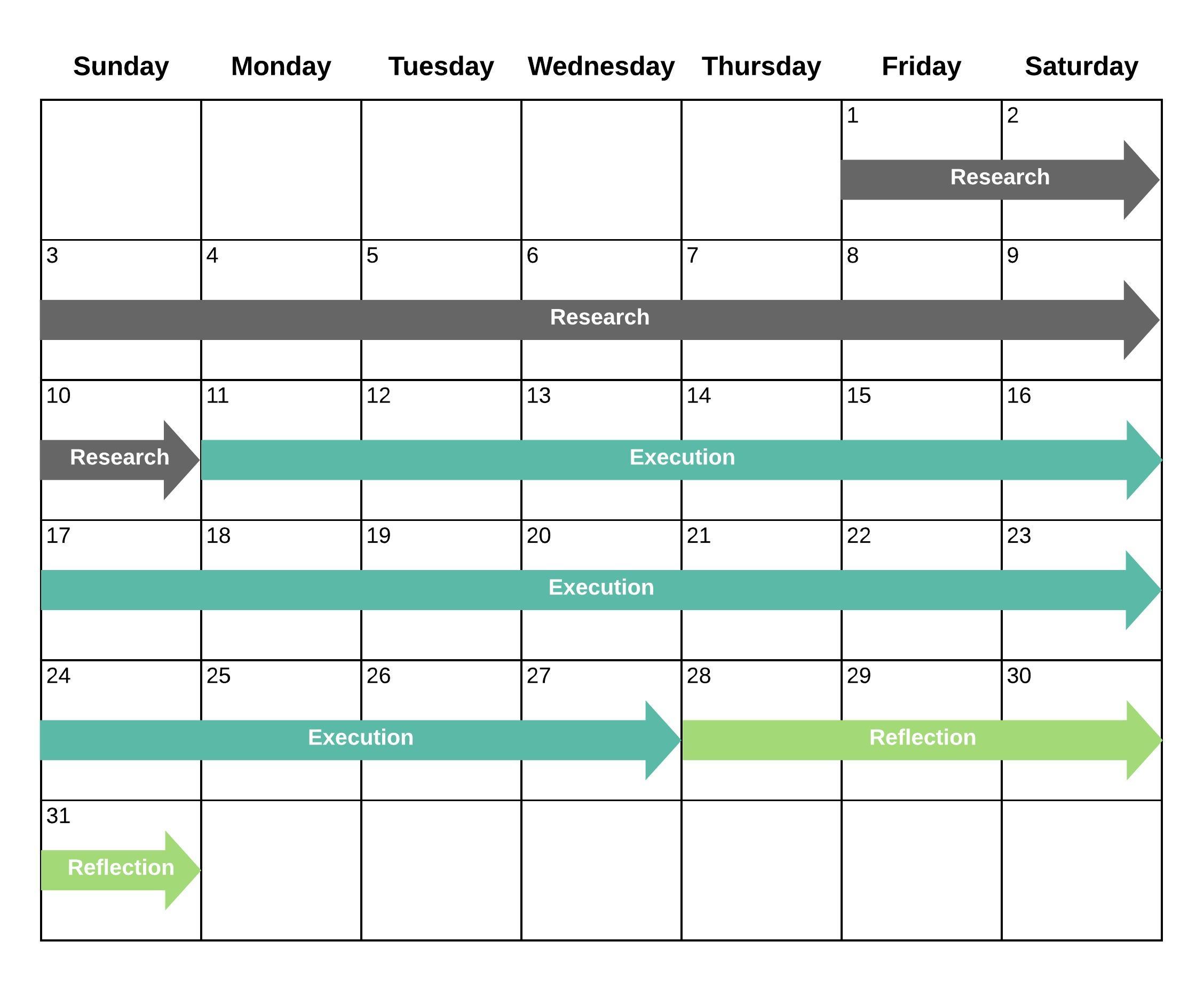 This calendar shows the distribution of activities for a hypothetical month. Each of the three timeframes: Research, Execution, and Reflection are explained in more detail below.